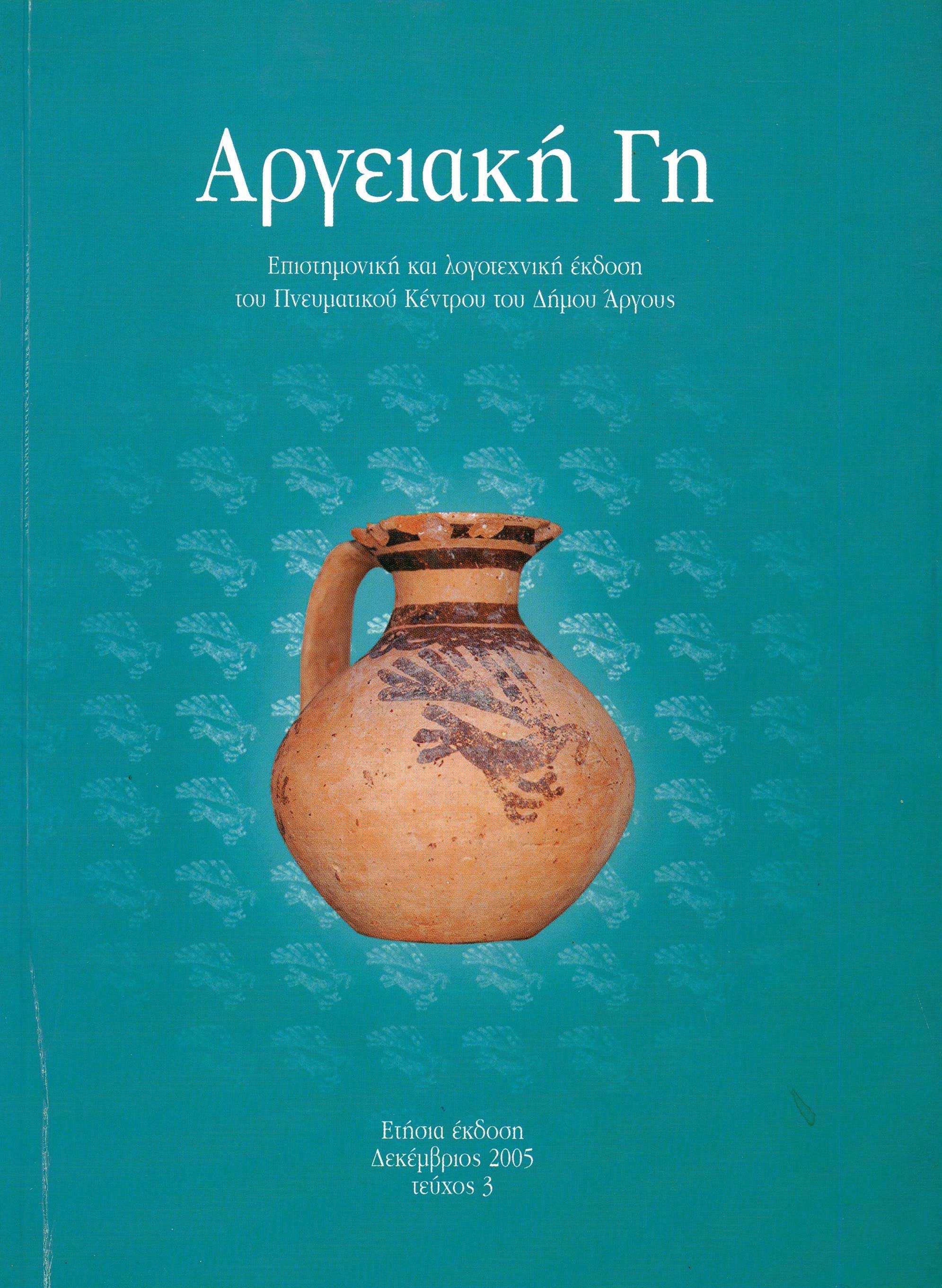 Αργειακή Γη. Τεύχος 3, Δεκέμβριος, 2005. Στο εξώφυλλο εικονίζεται, Πρόχους των ύστερων Μεσοελλαδικών χρόνων από τις ανασκαφές στο Νοσοκομείο Άργους (Αρχαιολογικό Μουσείο Άργους).