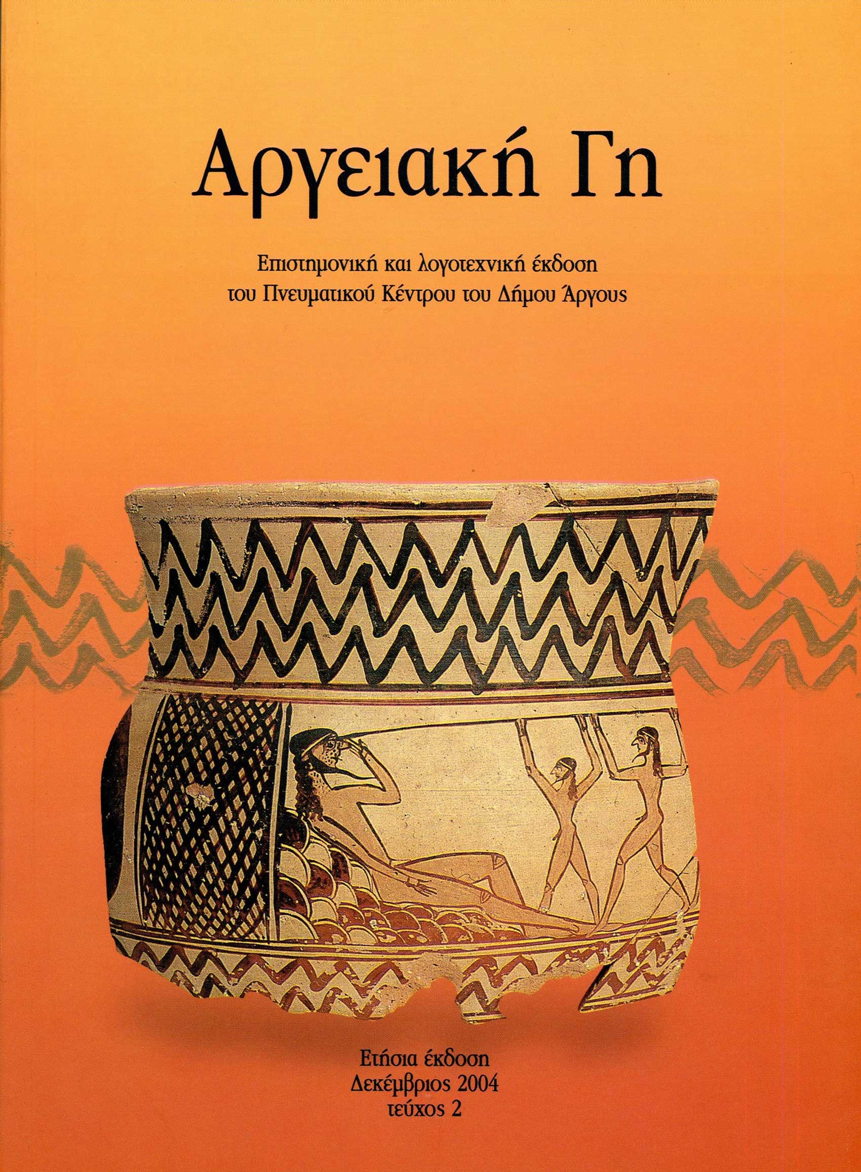 Αργειακή Γη. Τεύχος 2, Δεκέμβριος, 2004. Στο εξώφυλλο εικονίζεται, θραύσμα κρατήρα με παράσταση της τύφλωσης του Πολύφημου (Αρχαιολογικό Μουσείο Άργους).