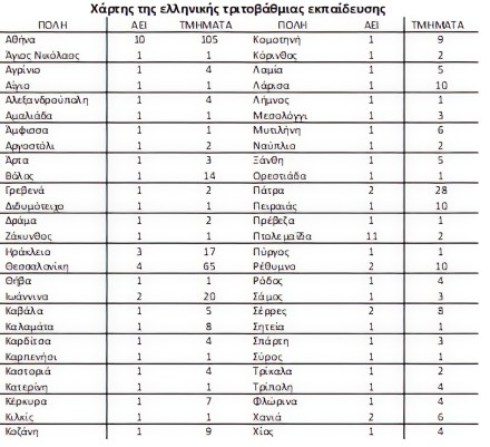Στη χώρα μας σήμερα 55 διαφορετικές πόλεις φιλοξενούν ανώτατα εκπαιδευτικά ιδρύματα. Το παρακμιακό σύνθημα του υπουργού αθλητισμού της δικτατορίας, «κάθε πόλη και στάδιο, κάθε χωριό και γυμναστήριο», βρήκε εφαρμογή κατά τη διάρκεια της μεταπολίτευσης στο χώρο των Πανεπιστημίων. Η Ελλάδα διαθέτει 23 πανεπιστήμια με περισσότερα από 420 πανεπιστημιακά τμήματα. Πάρα πολλά ΑΕΙ για τον πληθυσμό της. Η Ολλανδία με περίπου 50% περισσότερους κατοίκους, το ένα τρίτο της έκτασης της Ελλάδας και ισχυρότερη οικονομία με τετραπλάσιο σχεδόν ΑΕΠ, έχει μόλις δεκατρία πανεπιστήμια και θεωρείται χώρα πρωτοπόρος στην οικονομία της γνώσης, με αξιοπρόσεκτη ακαδημαϊκή παραγωγή (δημοσιεύσεις, πατέντες), εκατοντάδες καινοτόμες εταιρείες και με υψηλής ποιότητας στελέχη.