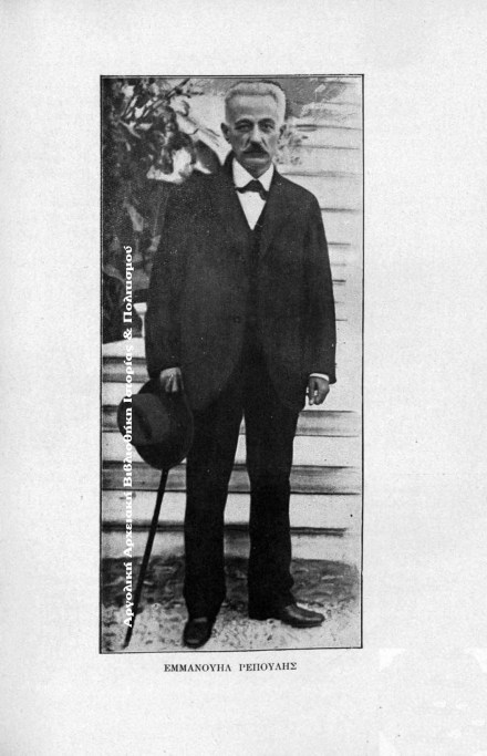 Εμμανουήλ Ρέπουλης, πολιτικός και στενός συνεργάτης του Ελευθέριου Βενιζέλου. Δημοσιεύεται στο: Γεώργιος Βεντήρης: «Η Ελλάδα του 1910-1920», τόμος Β’, Αθήναι, 1931.