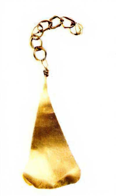 Εικ.10. Χρυσό περίαπτο, το μοναδικό κόσμημα που βρέθηκε στην Ασπίδα (μήκος 3,5 εκ.). Χρονολογείται στην πρώτη φάση του ΜΕ οικισμού (φωτ. Ph. Collet).