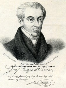 Ιωάννης Καποδίστριας. Εικόνα από λιθογραφία του Μύλλερ, σχέδιο εκ του φυσικού. Φέρει την υπογραφή του Καποδίστρια με τη φράση: «Αυτό που με κολακεύει περισσότερον είναι να ζήσω εις την ανάμνησιν των ανθρώπων ». Η λιθογραφία επανεκτυπώθηκε στην Καρλσρούη με σκοπό τα έσοδα από τις πωλήσεις να διατεθούν υπέρ του Αγώνα των Ελλήνων.