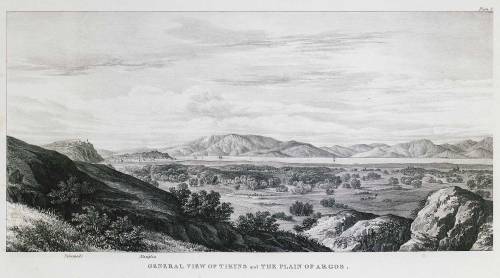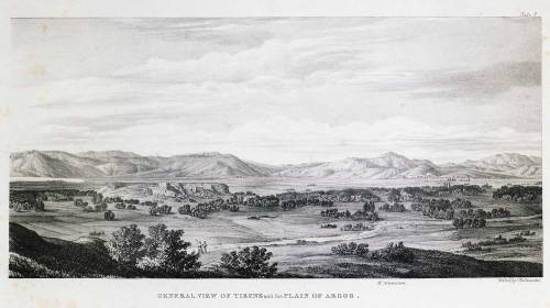 Άποψη της πεδιάδας του Άργους από τα ερείπια της Τίρυνθας. Στο βάθος το Ναύπλιο με το Μπούρτζι. Έντουαρντ Ντόντουελ (Edward Dodwell), λιθογραφία, Λονδίνο,1834.