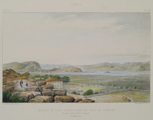Άποψη των τειχών της αρχαίας Τίρυνθας. Στο πρώτο επίπεδο απεικονίζεται η Γεωργική Σχολή της Τίρυνθας (σήμερα Αγροτικές Φυλακές), την οποία ίδρυσε ο Ιωάννης Καποδίστριας. Στο βάθος διακρίνονται το Ναύπλιο και το Μπούρτζι. Etienne Rey, Λυόν, 1867.