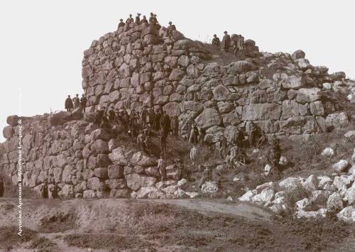 Τίρυνθα, ταξιδιωτική συντροφιά πάνω στην αναβάθρα και στην πύλη της Ακρόπολης, 1899. Φωτογραφία: Γερμανικό Αρχαιολογικό Ινστιτούτο, Παράρτημα Αθηνών.
