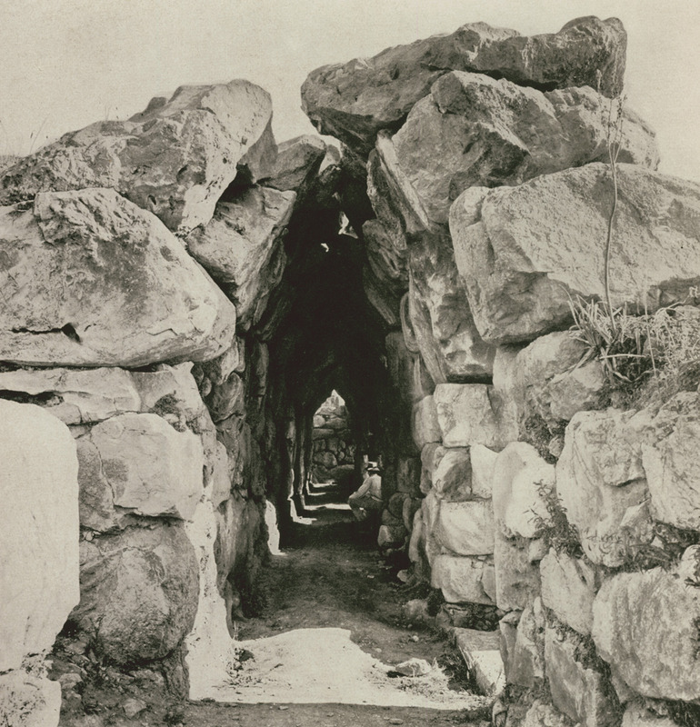 Η ανατολική θολωτή γαλαρία στην ακρόπολη της Τίρυνθας, από τα νότια, το 1923. Η φωτογραφία απεικονίζει ίσως το πιο διάσημο και χαρακτηριστικό σημείο της ακρόπολης, μια από τις θολωτές «Γαλαρίες», οι οποίες χτίστηκαν στα νότια και στα ανατολικά της Άνω ακρόπολης. Πρόκειται για μακρόστενους διαδρόμους με τοξωτή οξυκόρυφη στέγη, που οδηγούν σε τετράγωνα δωμάτια του τείχους.