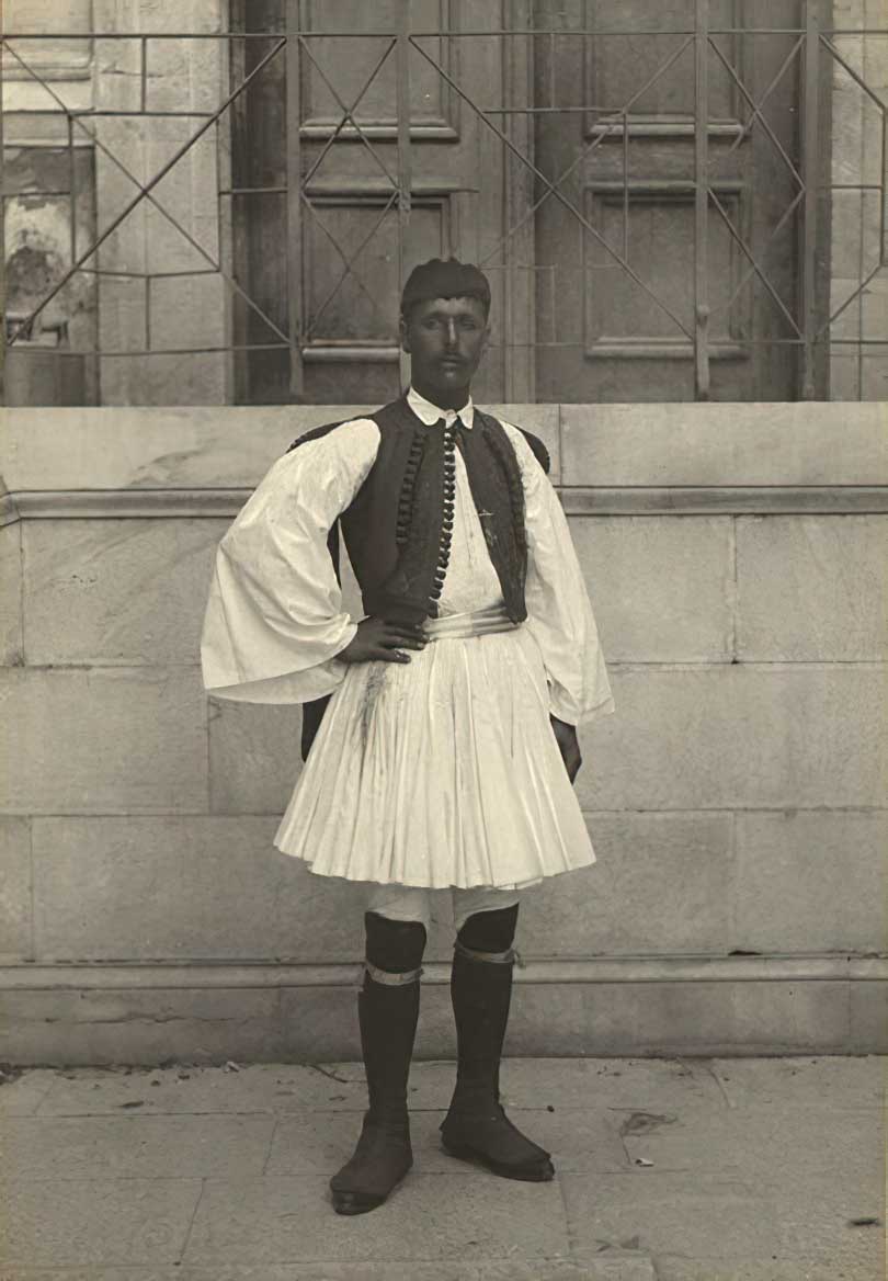 Ο Σπύρος Λούης (1873-1940), ο μαραθωνοδρόμος νικητής στους Ολυμπιακούς Αγώνες του 1896, με παραδοσιακή ενδυμασία απαθανατισμένος από τον Γερμανό Άλμπερτ Μάγιερ, τον φωτογράφο των Ολυμπιακών Αγώνων του 1896.