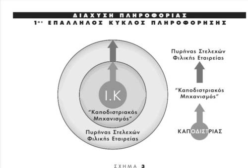 Πάρα την διπλή ιδιότητα τους, καταρχήν, ο πρώτος επάλληλος κύκλος πληροφόρησης διακρίνεται ακριβώς, αφενός, στα μέλη του «καποδιστριακού μηχανισμού» και, αφετέρου, στον στενό πυρήνα των στελεχών της Εταιρείας της Μόσχας, και σ’ αυτούς βεβαίως ανήκουν οι Α. Τσακάλωφ και Ν. Σκουφάς, οι οποίοι με αφετηρία την Οδησσό δημιουργούν και συντηρούν τα εταιρικά δίκτυα Φιλικών στις Ηγεμονίες, στην Πόλη και αλλού. Η πληροφόρηση των απόψεων του Καποδίστρια, επομένως, μεταφέρεται – πάντα κατά περίπτωση και συνθήκη – από τον ίδιο προς τα μέλη του μηχανισμού του και διαχέεται προς τον πυρήνα στελεχών της Εταιρείας, όπου ρόλο de facto συνδέσμου του πυρήνα Μόσχας παίζουν οι Καντιώτης[xxxii] και Κομιζόπουλος (Σχήμα 3).