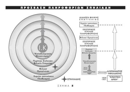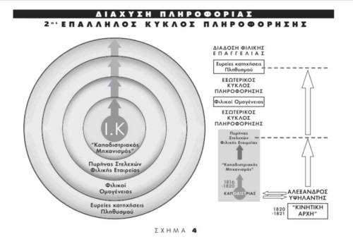 Είναι, ωστόσο, γεγονός ότι η εταιρική τομή του 1820 με την ανάθεση στον Αλέξανδρο Υψηλάντη της «Κινητικής Αρχής» αποτελεί αφετηρία διαμόρφωσης με πρακτικό τρόπο της κυοφορούμενης εξέγερσης και αντικαθιστά πλέον το γενικό αφήγημα των Φιλικών με συγκεκριμένες οδηγίες προετοιμασίας. Μέχρι, όμως, αυτήν την εταιρική τομή, οι καποδιστριακές απόψεις αυτό-περιορίζονται στον πρώτο επάλληλο κύκλο πληροφόρησης, ενώ ο ευρύτερος δεύτερος κύκλος πληροφόρησης αποτελεί το κατεξοχήν πεδίο του γενικού εταιρικού αφηγήματος. (Σχήμα 4).[xxxv]