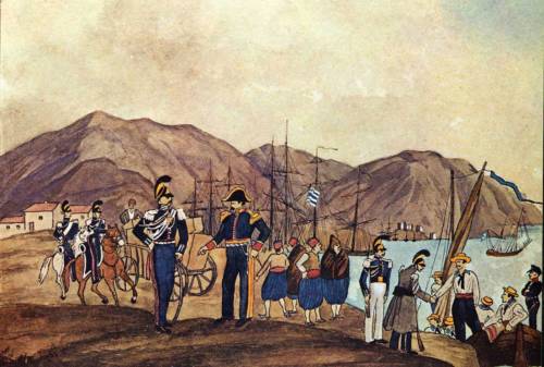 Έφιπποι και πεζοί χωροφύλακες και ναύτες στη Χαλκίδα (1835), κατά τα πρώτα έτη της βασιλείας του Όθωνα. Υδατογραφία του Βαυαρού λοχαγού του Βαυαρικού Εκστρατευτικού Σώματος και κατόπιν του Ελληνικού Στρατού, Ludwig Köllnberger.