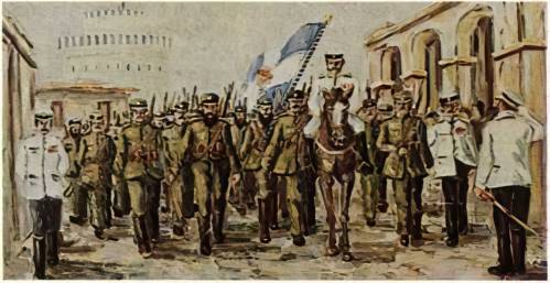 Τμήμα Χωροφυλακής με επικεφαλής τον τότε Υπομοίραρχο Μανωλκίδη κατά την είσοδο στην απελευθερούμενη Θεσσαλονίκη, πίνακας Χωροφ Δ. Ζαβερδινού από ιστορική φωτογραφία.