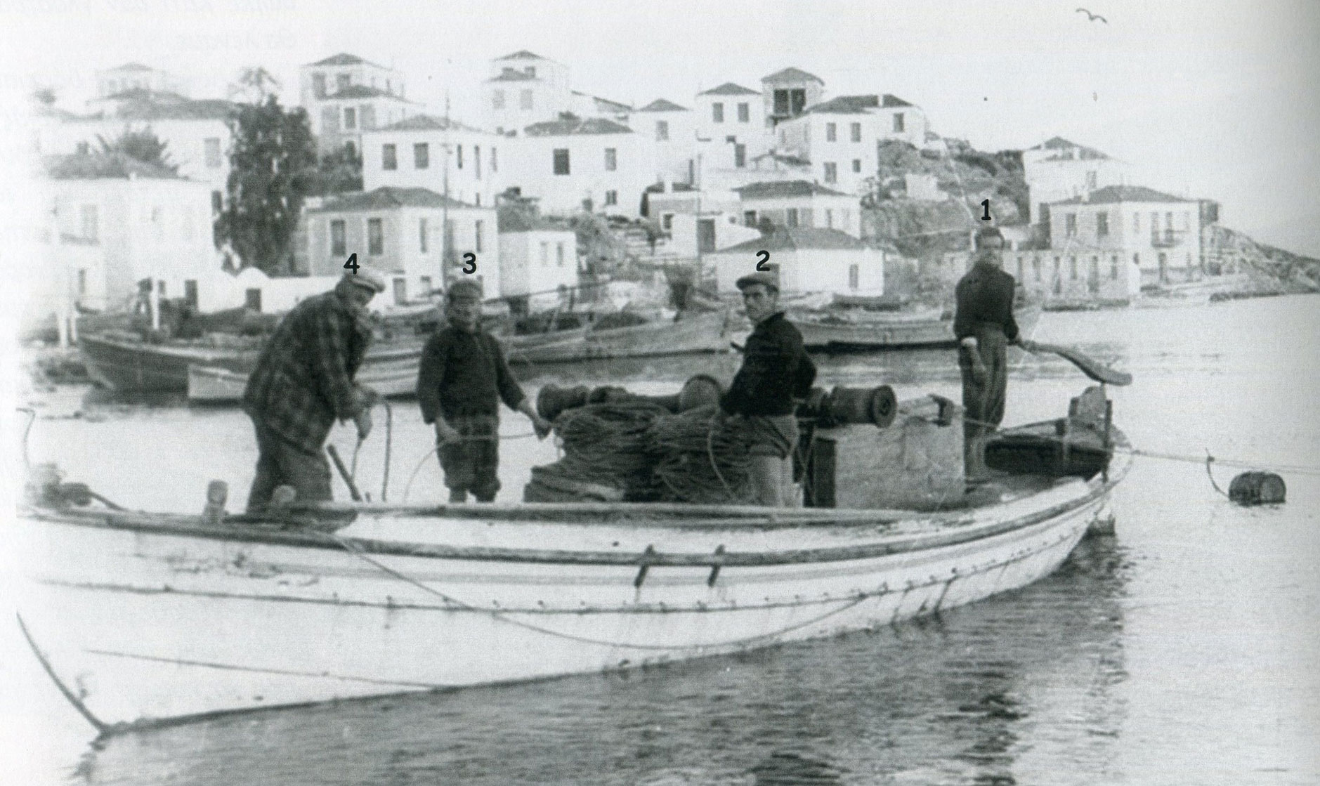 Ερμιόνη: Προετοιμασίες ψαρέματος. Η τράτα «ΑΛΥΣΜΟΝΗΤΟΣ», (12/12/1956). Διακρίνονται: Γιώργος Κωτσάκης (Μπαγάσας) (1 ), Γιάννης Κωτσάκης (Τζοβάνης) (2), Στρατής Χόντας (3) και Θανάσης Κωτσάκης (4).