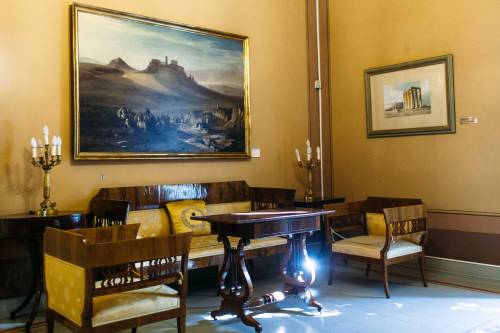 Το σαλόνι της Αμαλίας στο προσωρινό ανάκτορο του Όθωνα, στις οικίες Δεκόζη- Βούρου και Αφθονίδη (Μουσείον της Πόλεως των Αθηνών). Γερμανικό σαλόνι με καρέκλες, τραπεζάκια και έναν καναπέ. Υπάρχει κι ένα μαξιλαράκι που έχει πάνω το στέμμα και θεωρείται ότι το χρησιμοποιούσε η Αμαλία. Τα έπιπλα είναι στο γερμανικό στυλ biedermeier, που τότε θεωρούνταν πολύ αριστοκρατικά. Φωτό: Πάρις Ταβιτιάν / LIFO.
