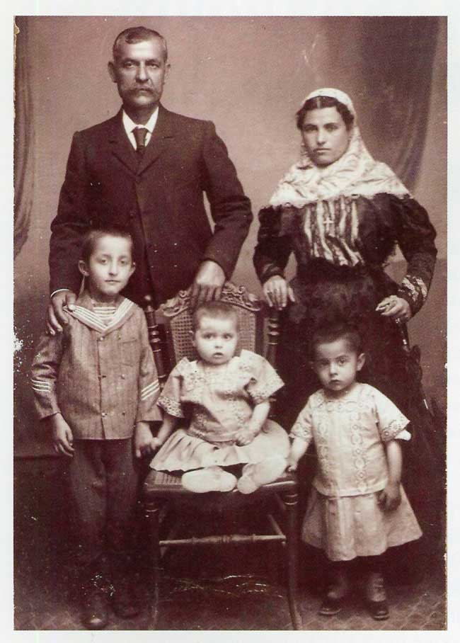 1912, Ο Βασίλης και η Αρχόντω Οικονόμου σε μια οικογενειακή φωτογραφία (Δημήτρης, Μιχάλης, Ηλίας). Αρχείο: Βιβή Σκούρτη.