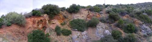 Πανοραμική άποψη (από ανατολικά – νοτιοανατολικά) της ανοικτής εκσκαφής στη θέση Καρακάσι. Με έντονο προτοκαλί-κόκκινο χρώμα παρατηρούνται οι επιφανειακές οξειδώσεις της μεταλλοφορίας με σιδηροπυρίτη.