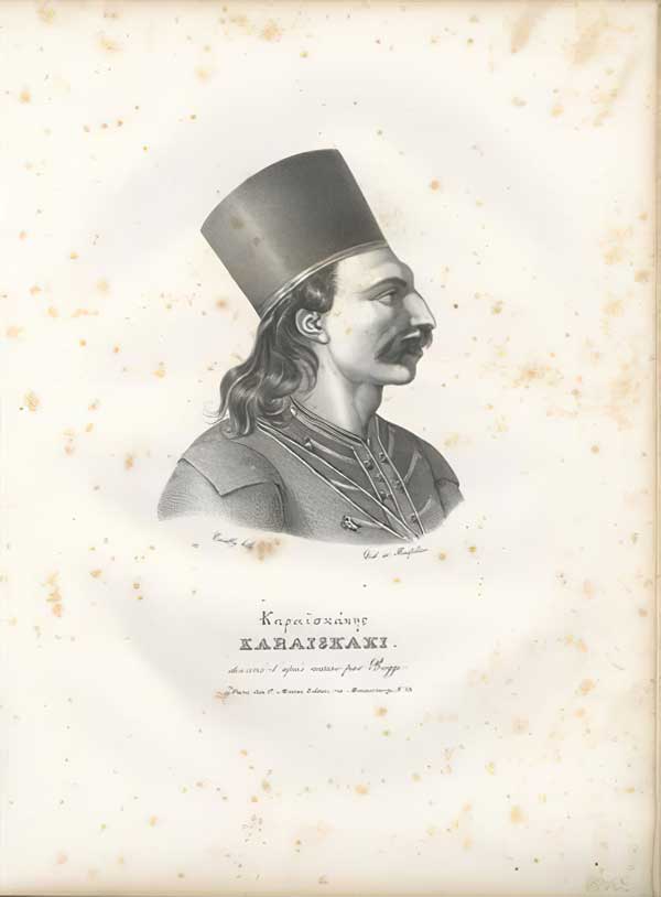 Γεώργιος Καραϊσκάκης. Λιθογραφία του Giovani Boggi από το λεύκωμα με 24 πορτραίτα Ελλήνων και Οθωμανών αξιωματούχων που έδρασαν κατά την Ελληνική Επανάσταση με τίτλο: «Collection de portraits des personnages Turcs and Grecs les plus recommes soit par leur cruate soit par leur bravoure dans la guerre actuelle de la Grece», Παρίσι, [1826]. Εθνικό Ιστορικό Μουσείο.