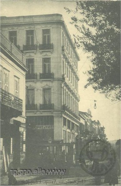 Το Μέγαρο Σπυράκη στον Πειραιά, στην οδό Φίλωνος. Το 1928 στεγαζόταν στον Β΄ όροφο η Τράπεζα Στρίγκου – Εμπειρίκου. Συλλογή του Ελληνικού Λογοτεχνικού και Ιστορικού Αρχείου (ΕΛΙΑ).