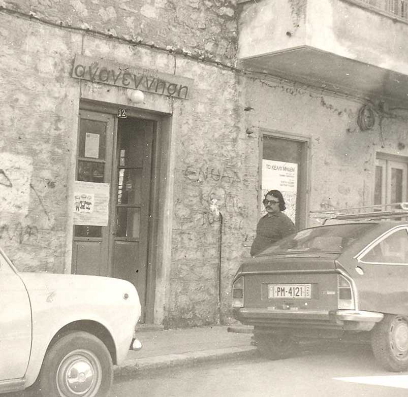Ο Γιάννης Ρηγόπουλος μπροστά από τα πρώτα γραφεία του βιβλιοπωλείου και της εφημερίδας «Αναγέννηση» κατά τα πρώτα μεταπολιτευτικά χρόνια στο Άργος (Βασιλέως Γεωργίου Ά). Πίσω του, στο τζάμι, η αφίσα για την προβολή της ταινίας του Γιάννη Σμαραγδή «Το Κελί Μηδέν», στην οποία είχε πρωταγωνιστικό ρόλο και ο συντοπίτης μας Βαγγέλης Καζάν.