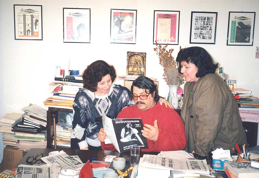 Στα γραφεία της «Αναγέννησης», ο Γιάννης με την καλή του φίλη Σούλα Ηλιοπούλου, και την νύφη του Δήμητρα Χαρίτου – Ρηγοπούλου.