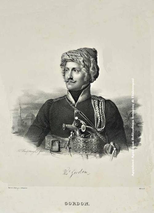 Ο Φιλέλληνας, ιστορικός και επικεφαλής του μικτού τάγματος στην πολιορκία της Τρίπολης, Τόμας Γκόρντον, έργο του Καρλ Κρατσάιζεν, Πόρος, 13 Απριλίου 1827. Επιζωγραφισμένη λιθογραφία.
