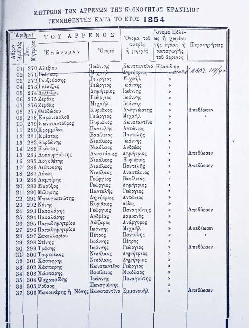 - Μητρώο Αρρένων Κρανιδίου 1843-1890, από το Δημοτολόγιο του Δήμου Ερμιονίδας.