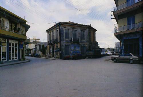 Εικόνα 2. Οικία Λουκά Ντούλια, επί της οδού Ναυπλίου 39 (δεκαετία 1940). Τα κτίσματα των εικόνων 1 και 2 ανήκουν στη μετανεοκλασική εποχή, αν δεχθούμε ότι η νεοκλασική περίοδος διαρκεί μέχρι και τη δεκαετία 1910. Όμως, τα νεοκλασικά στοιχεία αρχίζουν να χάνονται σιγά σιγά. Από το κτίσμα της εικ. 2, που είναι νεότερο, λείπουν τα ακροκέραμα και η διακοσμητική οδοντωτή ταινία της εικόνας 1.