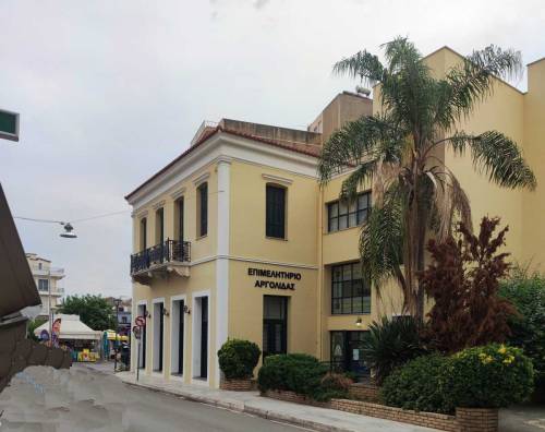 5. Κτίριο Εμπορικού και Βιομηχανικού Επιμελητηρίου Αργολίδας, Λαμπρινίδου και Κορίνθου στην πλατεία Δερβενακίων (ΦΕΚ 401 Δ/1982 και 495 Β/1991).[3] Πρόκειται για διώροφο κτίσμα, αρκετά μεγάλο και διακρίνεται για τη συμμετρική διάταξη των ανοιγμάτων. Είναι ιδιαίτερα εντυπωσιακό από τη θέση που βρίσκεται. Το μέγαρο αναπαλαιώθηκε το 1996 (εικ. 89). Το μέγαρο είχε περιέλθει στην κυριότητα του Δήμου το 1963, όταν πέθανε στην Ατλάντα των ΗΠΑ ο ομογενής Κων/νος Π. Μπαμπαλιάρος. Επιθυμία του δωρητή Μπαμπαλιάρου ήταν να χρησιμοποιηθεί το κληροδότημα ως κλινική για τους πτωχούς. Επειδή ο στόχος ήταν ανέφικτος, το Δημοτικό Συμβούλιο αποφάσισε, ύστερα από σύμφωνη γνώμη των Υπουργείων Οικονομικών και Κοινωνικών Υπηρεσιών, να εκποιηθεί και τα χρήματα να διατεθούν για την αποπεράτωση του νοσοκομείου. Έτσι, το 1972 αγοράστηκε από το Επιμελητήριο αντί του ποσού του 1.600.000 δρχ. Ο Μπαμπαλιάρος το είχε αγοράσει το 1917 από τον εμποροκτηματία Ιωάννη Γ. Μπότσο. Προηγούμενος ιδιοκτήτης ήταν ο Γεώργιος Αθ. Μπόμπος, ο οποίος – όπως μνημονεύεται στο συμβόλαιο – είχε αγοράσει το 1891 εργαστήριο με υπόγειο από τον Πέτρο Θ. Πετρίδη και τις Αγλαΐα και Βασιλική Δημ. Παπαστασινοπούλου. Πιθανότατα, ο Μπόμπος πρόσθεσε στη συνέχεια τον πρώτο όροφο, μετά το 1891.