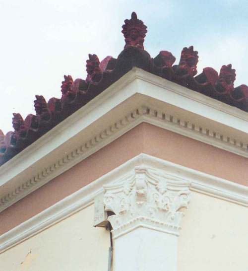 Ορισμένα κτίσματα, επίσης, στολίζονται με λεκάνες και ολόσωμα γλυπτά, που παριστάνουν γυναικείες μορφές, και τοποθετούνται στη στέγη (Δημαρχείο, κατάστημα Π. Βύρλου, εικ. 5).
