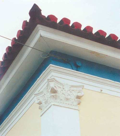 Η στέγη είναι κεραμωτή δίρριχτη ή τετράρριχτη και διακοσμείται περιμετρικά από τα γνωστά σε όλους μας ακροκέραμα, τα οποία παριστάνουν συνήθως ένα ανθέμιο και στις γωνίες συνήθως κάποια γυναικεία μορφή. Κάτω από τη στέγη υπάρχει περιμετρικά το γείσο, η κορνίζα του οικήματος, το οποίο κατασκευάζεται είτε με πέτρες είτε με τούβλα και στη συνέχεια επιχρίεται με ασβεστοκονίαμα. Ιδιαίτερη ομορφιά προσδίδει στο κτίσμα η οδοντωτή διακοσμητική ταινία, που διαμορφώνεται ακριβώς κάτω από το γείσο. Ο αρχιτέκτονας μπορεί εδώ να προσθέσει κι άλλα κοσμήματα, όπως τα ελικοειδή γεισοπόδια, τα οποία δίδουν την ψευδαίσθηση ότι το γείσο και η στέγη στηρίζονται σ’ αυτά.