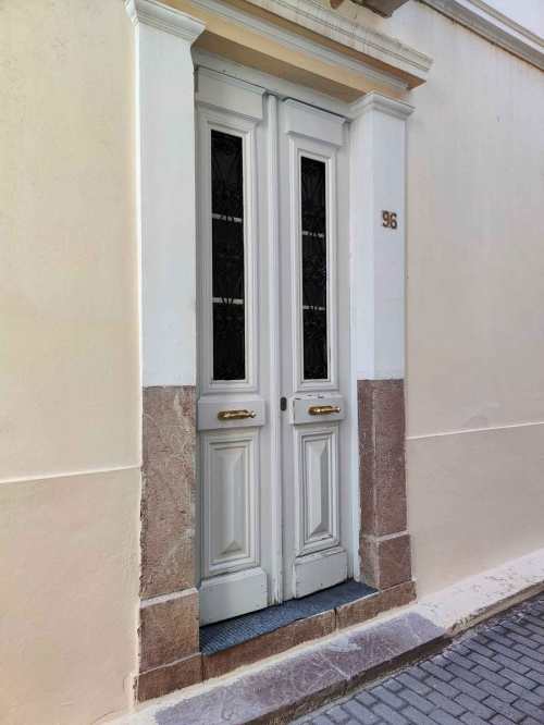 Η κύρια είσοδος του σπιτιού ευρίσκεται κάτω από το μπαλκόνι του πρώτου ορόφου. Οι παραστάδες συνήθως είναι από άσπρο μάρμαρο· το ίδιο και το ανώφλι. Πάνω από αυτό υπάρχει κάποτε ανάγλυφο στεφάνι και μέσα σ’ αυτό χαράσσεται το έτος ανέγερσης. Ανάλογα με τον πλούτο του ιδιοκτήτη και το μεράκι του αρχιτέκτονα, η κύρια είσοδος στολίζεται συμμετρικά με διάφορες παραστάσεις και αρχιτεκτονικά σχήματα.