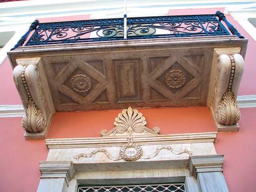 Ο εξώστης του μπαλκονιού και το ανώφλι της κύριας εισόδου της οικίας Καλλιάρχη με την κτητορική επιγραφή και το έτος ανέγερσης (1899).