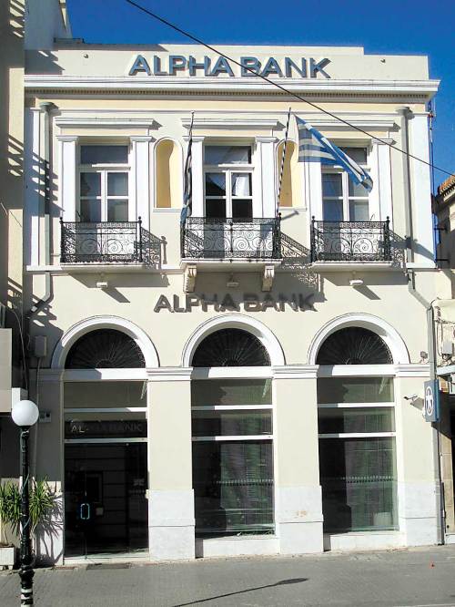 13. Θέση όπου οικοδομήθηκαν τρία νεοκλασικά κτίρια: Της Ιονικής-Λαϊκής Τράπεζας (Alpha Bank), το «Αέναον» και της Γενικής Τράπεζας.