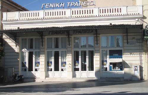 6. Κτίριο Γενικής Τράπεζας, πρώην καφενείο Θηβαίου, πλατεία Αγ. Πέτρου (ΦΕΚ 401 Δ/1982 και 334 Β/1983). Κτίστηκε στο τέλος του περασμένου αιώνα. Εκείνο που το κάνει να ξεχωρίζει είναι το στέγαστρο της πρόσοψης και οι πρόβολοι στήριξής του από σφυρήλατο σίδερο με ωραιότατα διακοσμητικά στοιχεία. Παλιότερα ήταν ιδιοκτησία Νικ. Σπηλιωτάκη, Κετσέα και Μητρόπολης και σήμερα του Μετοχικού Ταμείου Στρατού και στεγάζει τη Γενική Τράπεζα. Πιο πριν και για κάμποσα χρόνια είχε στεγάσει το καφενείο Μπαφίτη. Σαν καφενείο Θηβαίου άφησε ιστορία στην πόλη για τις καλλιτεχνικές εκδηλώσεις και τους χορούς, που γίνονταν εκεί προπολεμικά.