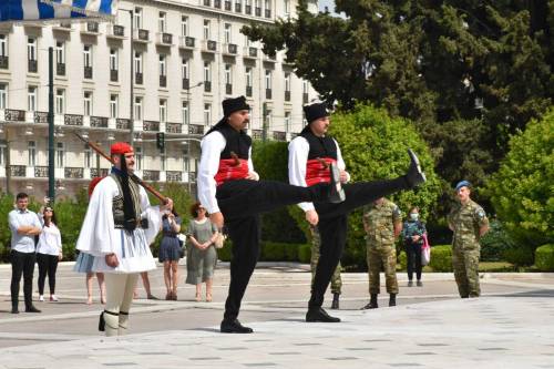 Εύζωνες με την επίσημη στολή κατά τη διάρκεια της υπηρεσίας τους, 2020. Η φωτογραφία δημοσιεύεται στον ιστότοπο της Προεδρίας της Ελληνικής Δημοκρατίας.