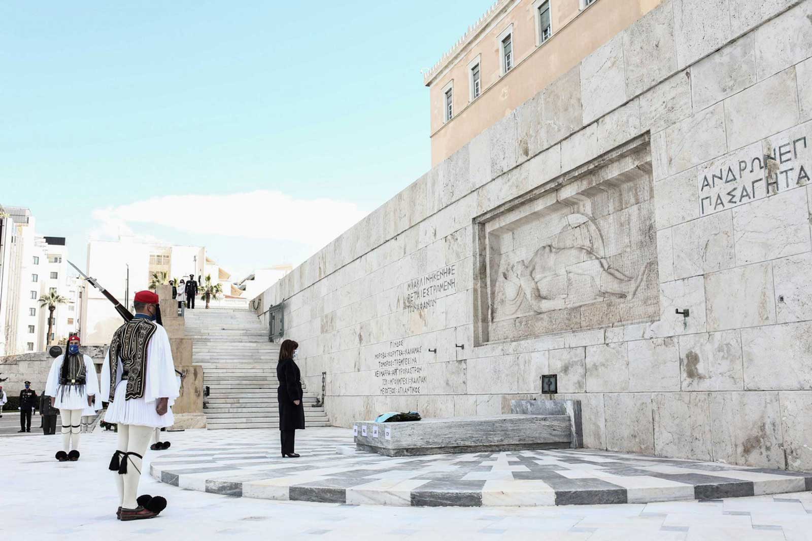 Κατάθεση στεφάνου από την Α.Ε. την Πρόεδρο της Δημοκρατίας Κατερίνα Σακελλαροπούλου, 2022. Η φωτογραφία δημοσιεύεται στον ιστότοπο της Προεδρίας της Ελληνικής Δημοκρατίας.