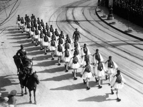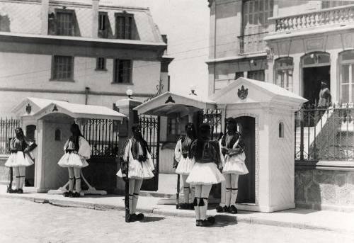Ανακτορική Φρουρά στην Ηρώδου Αττικού πριν 1940. Η φωτογραφία δημοσιεύεται στον ιστότοπο της Προεδρίας της Ελληνικής Δημοκρατίας.