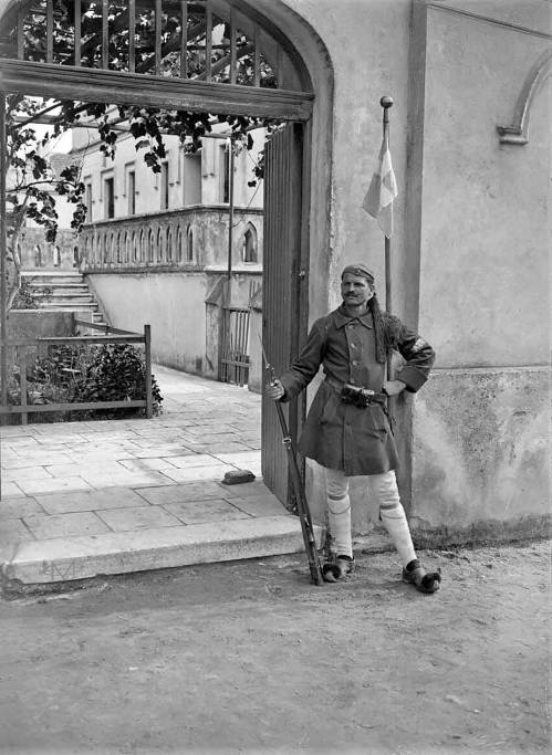 Εύζωνας φρουρός στην κατοικία του Στρατηγού Λεωνίδα Παρασκευόπουλου (στην πίσω είσοδο του Δημαρχείου Καβάλας). Καβάλα στις 30 Οκτωβρίου 1918.