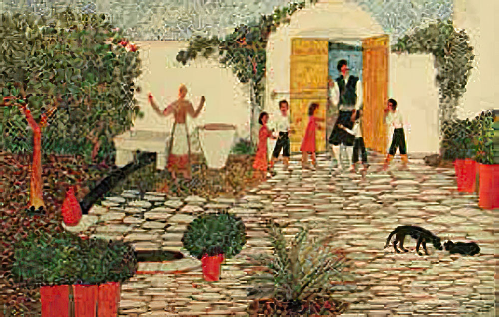 Η Ανθούλα Λαζαρίδου-Δουρούκου, δισέγγονη του καπεταν – Τουτούνη, ζωγράφισε την οικογένεια του προπάππου της σε μια φανταστική ώρα χαρούμενης υποδοχής του με τα πέντε παιδιά του σ’ αυτήν την αυλή.