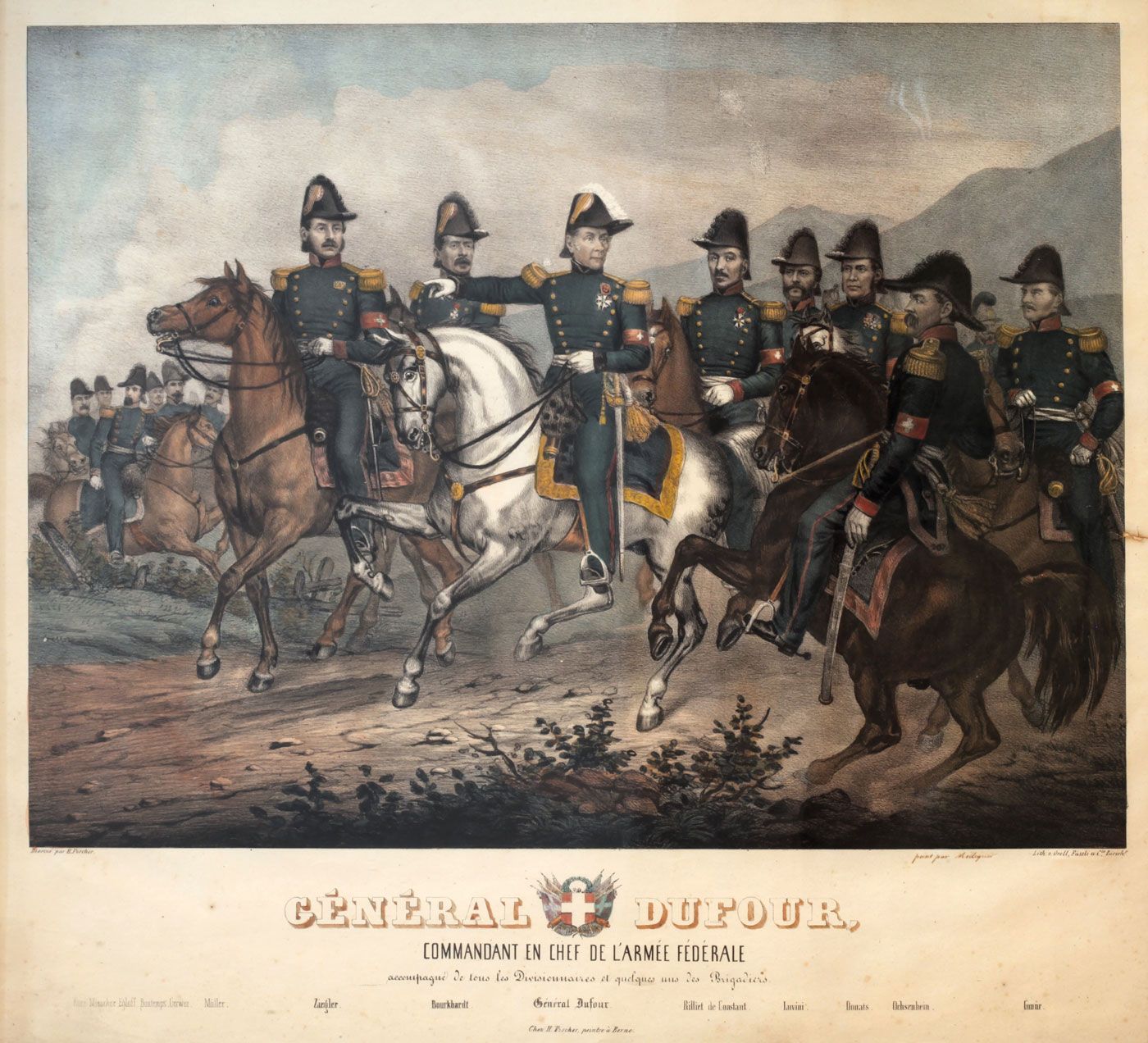Ο Στρατηγός Ντυφούρ, με ανώτατους αξιωματικούς. Πίνακας H. Fischer, λιθογραφία Orell, Füssli and co, Zürich, 1848, τέταρτος από αριστερά.