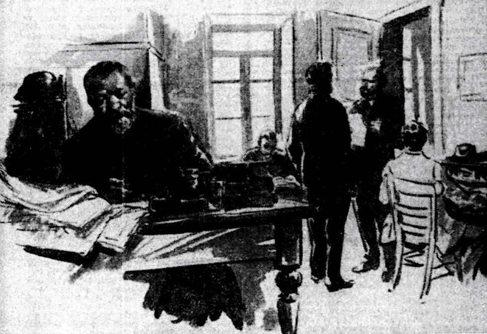 Ο Παπαδιαμάντης στα γραφεία της Ακροπόλεως (σχέδιο του Νίκου Νομικού).