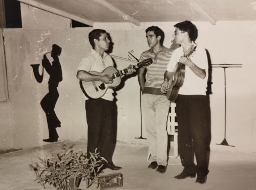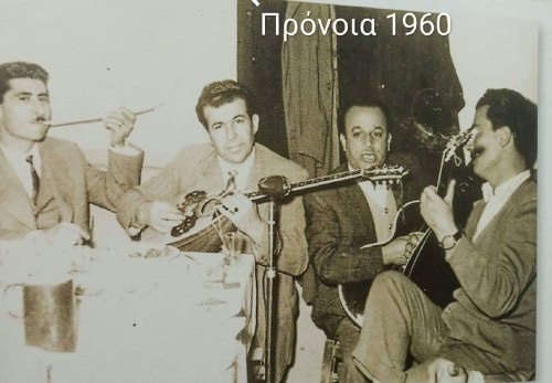 Ταβέρνα Κατσεχάμου, 1962. Διακρίνουμε αριστερά τον Γιάγκο τον Κατσίγιαννη με την κιθάρα του, αριστερά στο τραπέζι τον Φάνη Ξυλά, πίσω του ο Θοδωράκης Θεοδωρόπουλος και όρθιος με την κιθάρα ο Κώστας Ρουκουνιώτης. Φωτογραφία, Μάκης Κομνηνός.