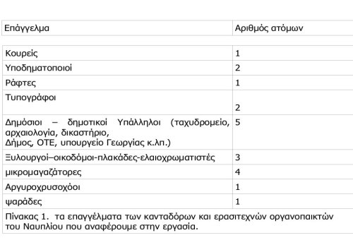 Αυτός ο αστικός χαρακτήρας του Ναυπλίου παρέμεινε διαχρονικά ίδιος και μετά την Ελληνική Επανάσταση. Όπως καταγράφεται σε απογραφή του πληθυσμού της πόλης το 1861 σε σύνολο 6.024 ατόμων υπήρχαν 1.032 στρατιωτικοί, 363 βιομήχανοι (βιοτέχνες), 87 έμποροι, 103 δημόσιοι υπάλληλοι, 53 επιστήμονες, 12 κληρικοί και 32 δικηγόροι.[16]