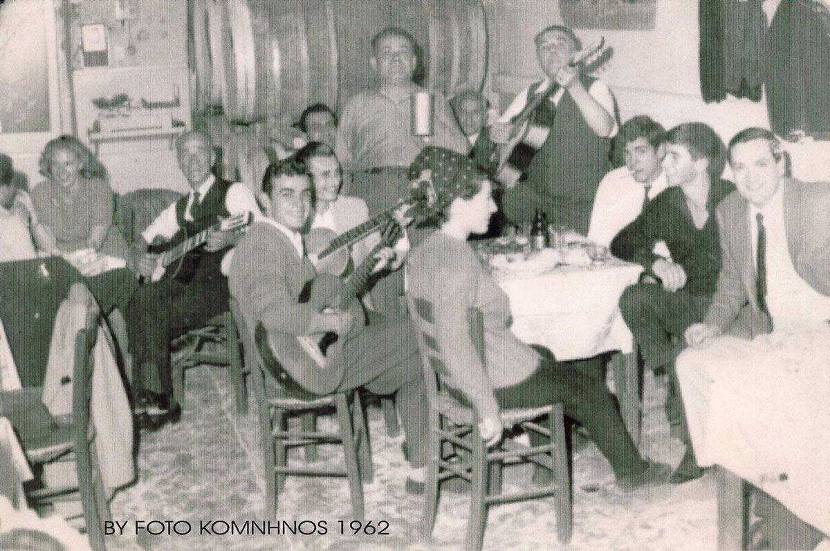 Ταβέρνα Κατσεχάμου, 1962. Διακρίνουμε αριστερά τον Γιάγκο τον Κατσίγιαννη με την κιθάρα του, αριστερά στο τραπέζι τον Φάνη Ξυλά, πίσω του ο Θοδωράκης Θεοδωρόπουλος και όρθιος με την κιθάρα ο Κώστας Ρουκουνιώτης. Φωτογραφία, Μάκης Κομνηνός.