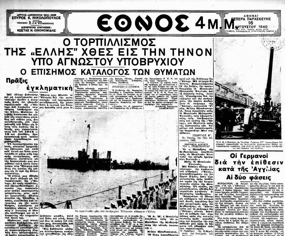 Ο τορπιλισμός της «Έλλης» στην Τήνο » Η-εφημερίδα ΈΘΝΟΣ