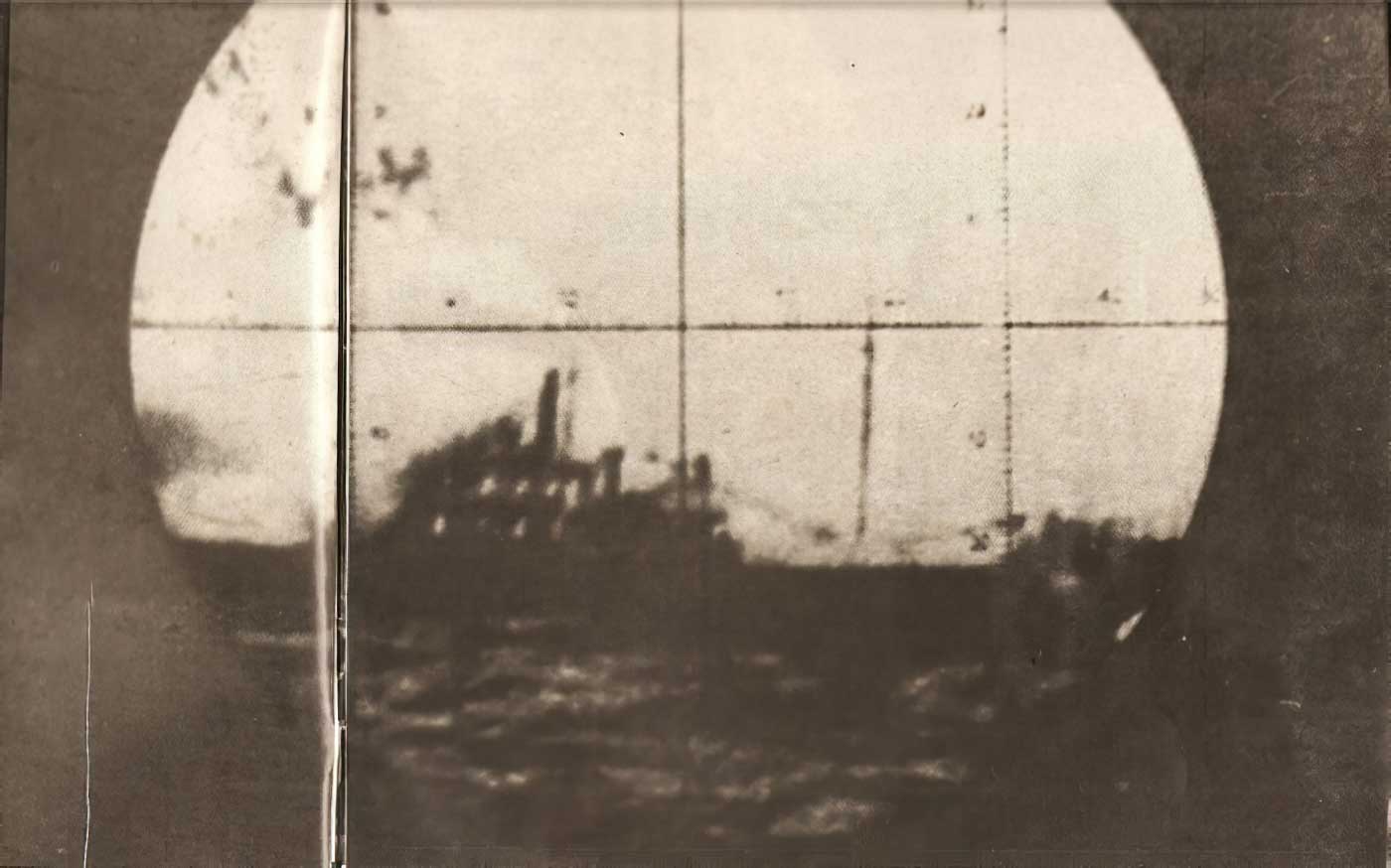 Ο τορπιλισμός της «Έλλης» στην Τήνο » Το Έλλη μέσα από το περισκόπιο του υποβρυχίου Ντελφίνο.