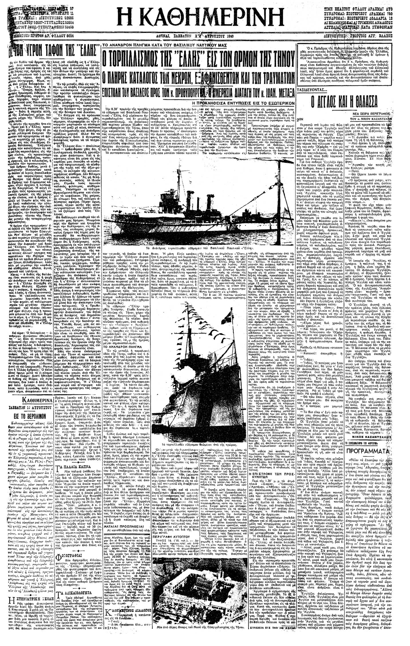 Ο τορπιλισμός της «Έλλης» στην Τήνο » Εφημερίδα «Καθημερινή», Σάββατο 17 Αυγούστου 1940.
