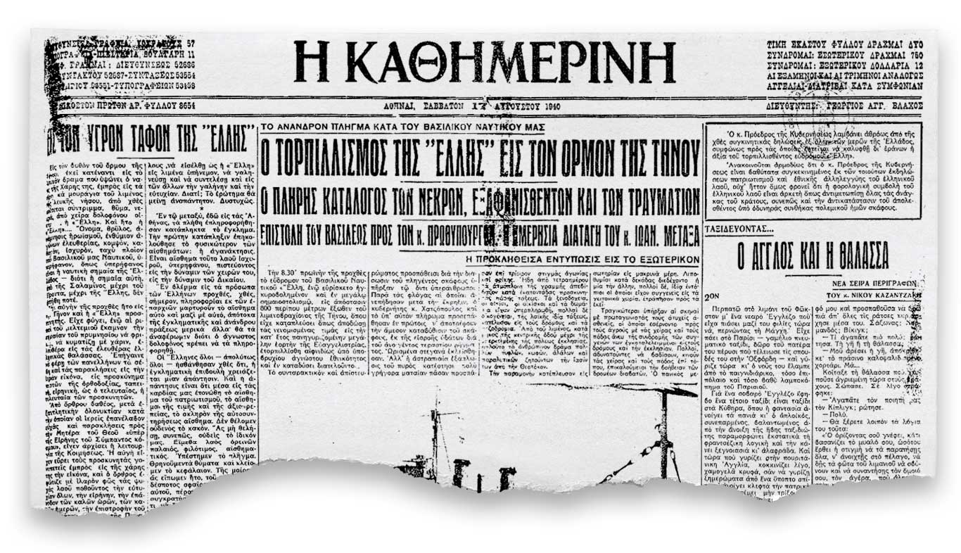 Ο τορπιλισμός της «Έλλης» στην Τήνο » Εφημερίδα «Καθημερινή», Σάββατο 17 Αυγούστου 1940.