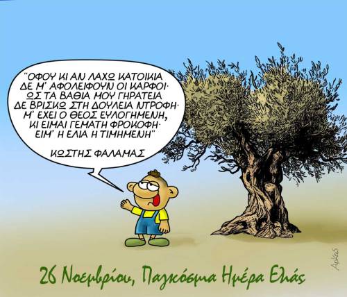 Για την Παγκόσμια Ημέρα Ελιάς, ο Αρκάς σκιτσάρει τον μικρό Σπύρο να απαγγέλλει ένα απόσπασμα ποιήματος του Κωστή Παλαμά για την Ελιά, συνδέοντας το χιούμορ με την ελληνική παράδοση και τον πολιτισμό. Η ελιά – η «ευλογημένη», όπως την αποκαλεί ο ποιητής – παρουσιάζεται όχι μόνο ως σύμβολο καρποφορίας και ειρήνης, αλλά και ως στοιχείο ταυτότητας του τόπου.