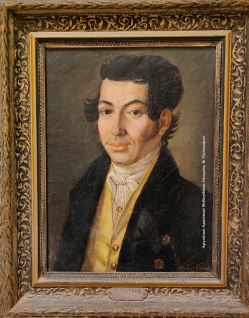 Ιωάννης Καποδίστριας, έργο του Κ. Γιατρά, λάδι σε χαρτόνι κολλημένο σε ξύλο, 34×27 εκ. Πινακοθήκη Παπαδόπουλου, Πανελλήνιο Ιερό Ίδρυμα Ευαγγελιστρίας Τήνου.