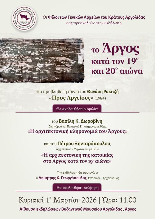 Οι «Φίλοι των Γενικών Αρχείων του Κράτους (ΓΑΚ) Αργολίδας» διοργανώνουν εκδήλωση στο Άργος με θέμα «Το Άργος κατά τον 19ο και 20ο αιώνα». Η εκδήλωση θα πραγματοποιηθεί την Κυριακή 1η Μαρτίου 2026, στις 11πμ, στην αίθουσα διαλέξεων του Βυζαντινού Μουσείου Αργολίδας. Το πρόγραμμα της εκδήλωσης διαρθρώνεται ως εξής: